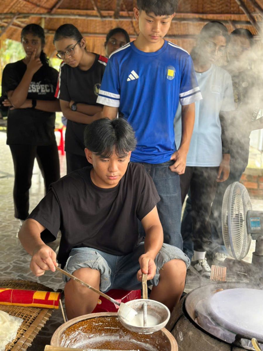 Trong chương trình, các em được hướng dẫn tham quan mô hình trồng rau thủy canh hiện đại, tìm hiểu quy trình sản xuất nấm trong nhà nuôi trồng chuyên dụng, cũng như trải nghiệm thực hành làm bánh tráng truyền thống – một nét đặc trưng trong văn hóa ẩm thực Việt Nam. Thông qua các hoạt động này, học sinh không chỉ được tiếp cận những ứng dụng khoa học – công nghệ trong sản xuất nông nghiệp, mà còn có cơ hội hiểu thêm về nghề nông, lao động thủ công và giá trị văn hóa bản địa.