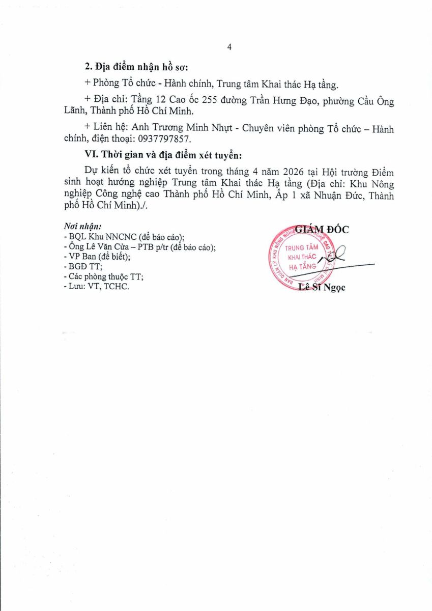 – Địa điểm nhận hồ sơ: Phòng Tổ chức – hành chính, Trung tâm Khai thác Hạ tầng Khu Nông nghiệp Công nghệ cao TP.HCM