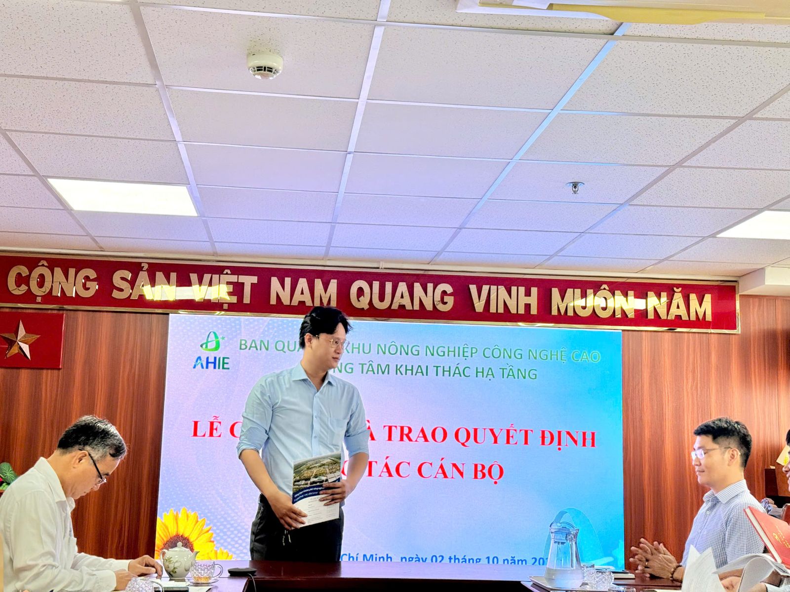 Ngày 02/10, Trung tâm Khai thác Hạ tầng tổ chức lễ công bố và trao quyết định bổ nhiệm lại các chức danh Trưởng, Phó phòng chuyên môn theo Công văn số 1349/NNCNC-VP ngày 23/9/2025 của Ban Quản lý Khu Nông nghiệp Công nghệ cao về việc chấp thuận chủ trương bổ nhiệm cán bộ.