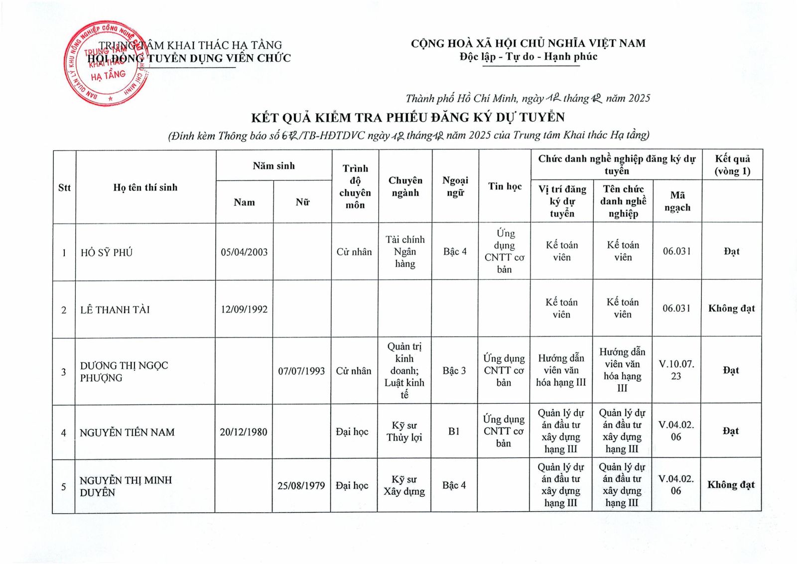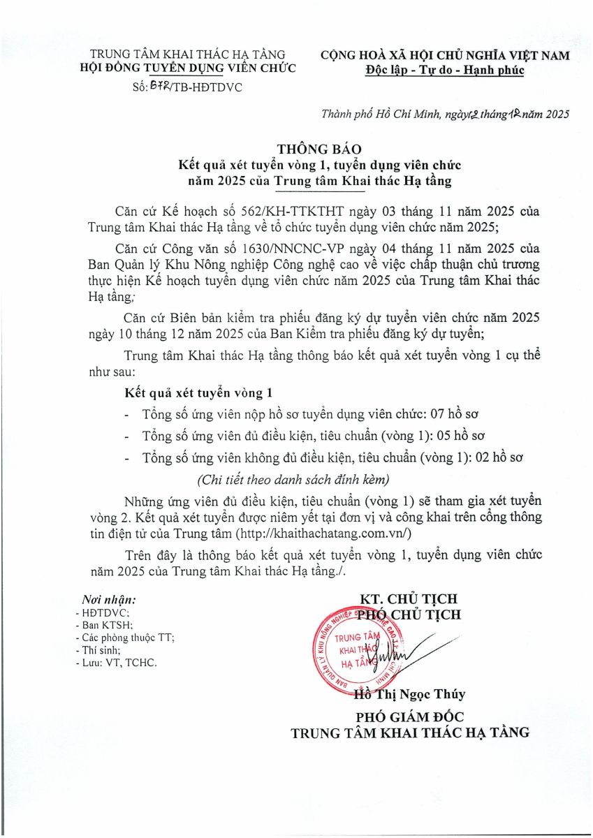 Trung tâm Khai thác Hạ tầng thông báo kết quả xét tuyển vòng 1, tuyển dụng viên chức năm 2025, cụ thể như sau: